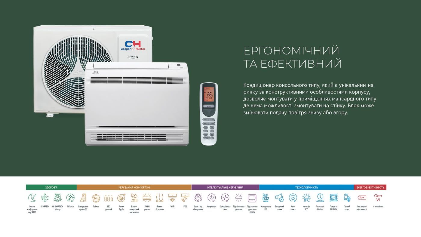 Cooper&Hunter Console Inverter — практичне та ефективне рішення для приміщень, де важливі комфортний обігрів, економія електроенергії та гнучкість монтажу.