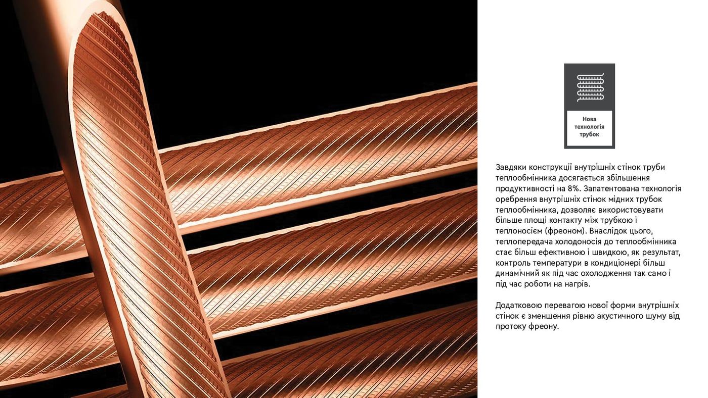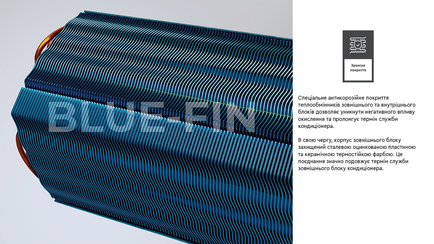 Теплообмінник зовнішнього блоку має антикорозійне покриття, що подовжує термін його служби.