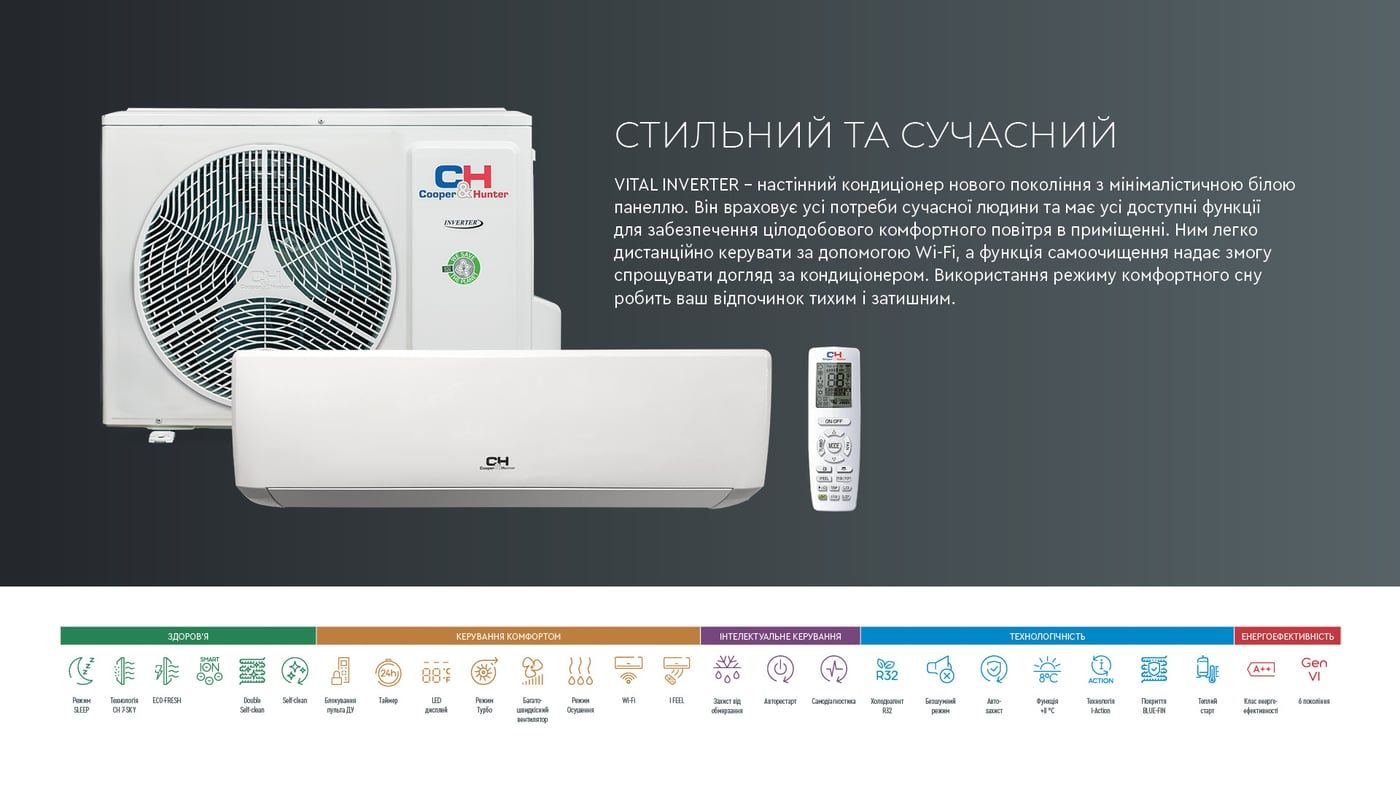 Кондиціонер серії Vital входить до трійки лідерів продажів інверторних кондиціонерів Cooper&Hunter. Це абсолютно нова модель з сучасним, компактним дизайном, розширеним функціоналом охолодження, нагріву, багатоступеневого очищення, осушення повітря та вентиляцією. Завдяки інтегрованому модулю Wi-Fi керування обладнанням можливе через смартфон/планшет, що робить управлення максимально зручним та швидким.