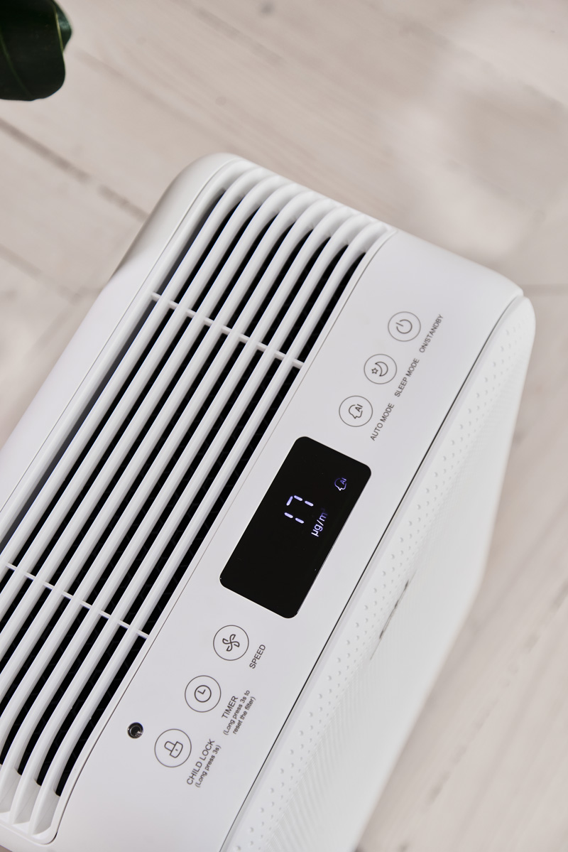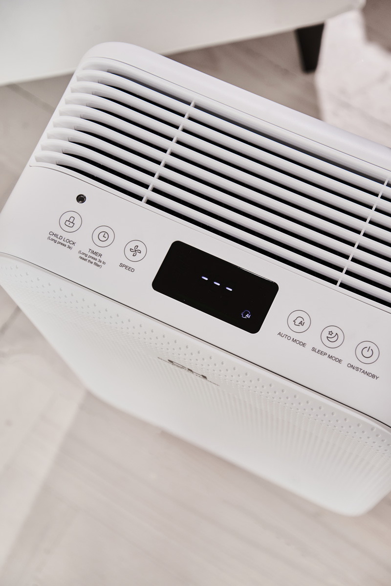 Очищувач оснащений лазерним датчиком, який аналізує повітря і показує кількість мікрочастинок на дисплеї. А також якість повітря візуалізується світловим індикатором: Блакитний (чисте повітря), зелений (Невеликі забруднення), помаранчевий (брудне повітря), червоний (дуже брудне повітря).
