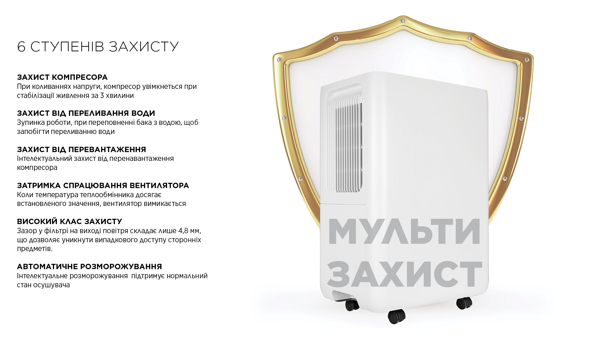 Cooper&Hunter WD10 WF CH-D005WD10-12LD UWF поєднує у собі 3 функції в одному пристрої: осушення, очищення та знезараження повітря. Це ідеальне рішення для квартир, будинків, офісів, дитячих кімнат і будь-яких приміщень до 25 м².