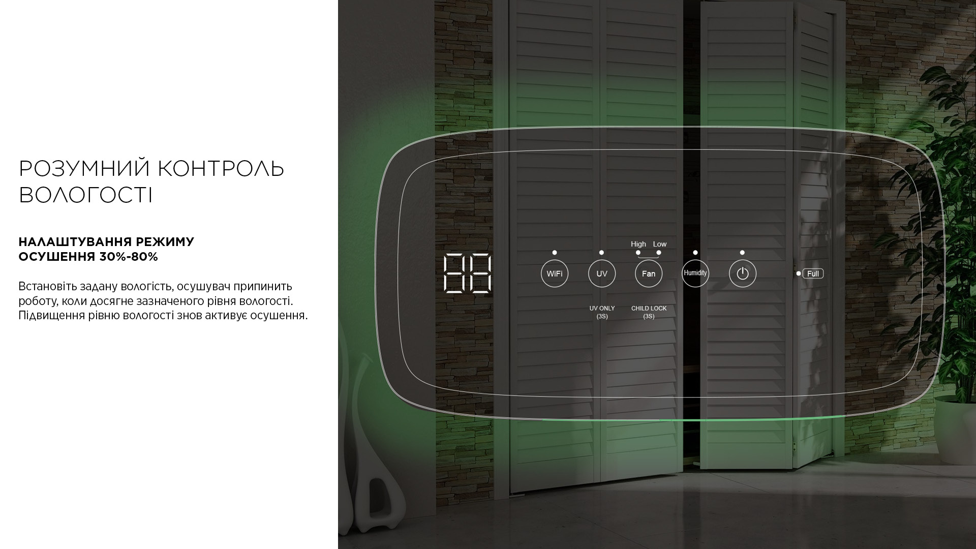 Забудьте про конденсат, цвіль і грибок! Пристрій видаляє до 12 л вологи на добу та підтримує вологість на рівні, який ви оберете.