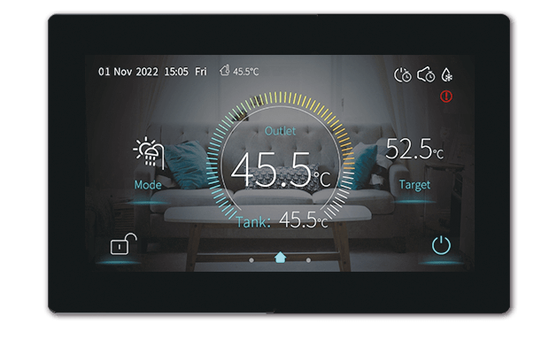 Теплові насоси виконані у моноблочному форматі, що не потребує розміщення обладнання всередині приміщення. Усі ключові вузли та агрегати розташовані в зовнішньому блоці, а всередині встановлюється лише сучасний контролер із 5-дюймовою сенсорною LCD SMART панеллю, на якій відображається повна інформація про роботу системи.